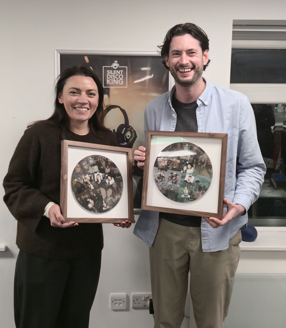 Our wonderful General Manager, Oana Buhus, and Head of Sales and Events, Elliot Bedford, were gifted these custom commemorative Silent Disco King 10-year anniversary vinyls by our Director, Paul Gillies. Huge congratulations to Elliot and Oana - “hip, hip hooray!”